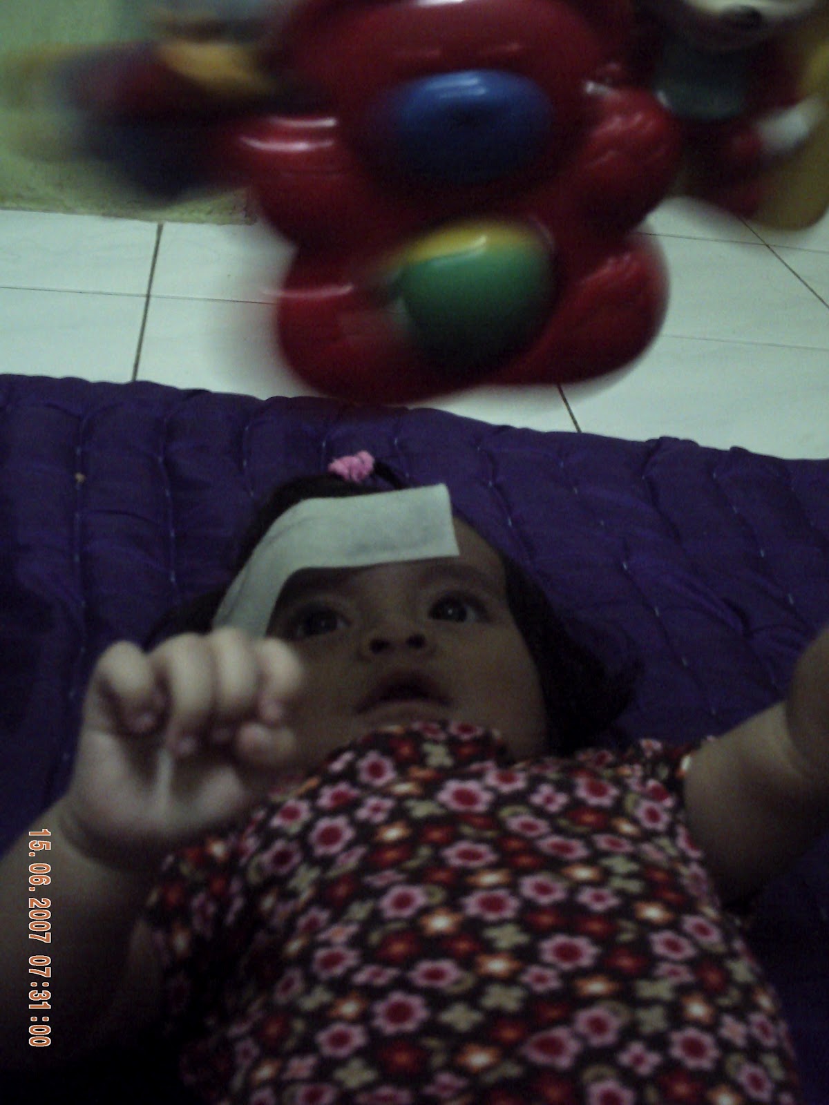 Allya dari malam lagi suhu badannye x turun2... Mcm2 care aku ikhtiarkan bagi panasnye kurang. Nsib baiklah tidur malamnye ok, x merengek2. Alhamdulillah, siangnye pun ok, dok leka main sengsorang cume x lah seaktif seperti biase... Tengoklah sampai senget benget jadinye cool fever kat dahinye tu. Allya, allya....